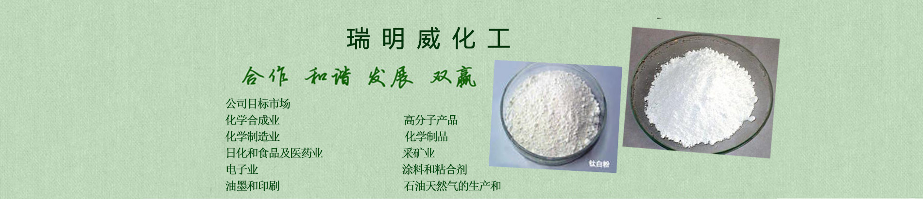 天津市瑞明威化工有限公司公司概況公司本著“興業(yè)、興人、興社會”的三興企業(yè)文化在業(yè)內(nèi)有著崇高的聲譽(yù)產(chǎn)品覆蓋面大,銷售輻射華東、華南、華北數(shù)百種產(chǎn)品,多種銷售模式可供選擇華東、華北、沿海、沿江長期包租有儲罐和倉庫提供個性化的完全服務(wù),解決用戶在化學(xué)品使用中的一切煩惱供應(yīng)鏈外包 個性化定裝與標(biāo)簽 來料加工業(yè)務(wù) 分包裝 化工超市 買方庫存管理公司目標(biāo)市場化學(xué)合成業(yè) 高分子產(chǎn)品化學(xué)制造業(yè) 化學(xué)制品日化和食品及藥業(yè) 采礦業(yè)電子業(yè) 涂料和粘合劑油墨和印刷 石油天然的生產(chǎn)和提煉